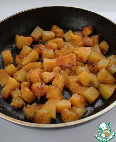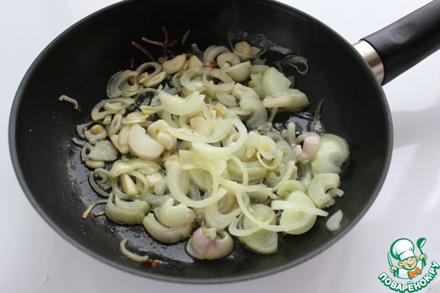 В топленом масле обжарьте до золотистого цвета по отдельности сначала лук с чесноком.