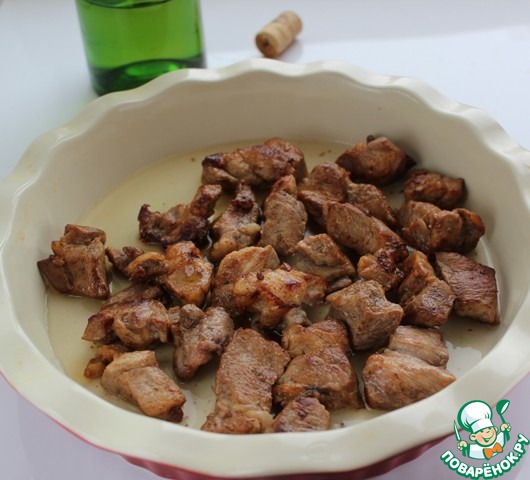 Положите мясо в жаропрочную форму, влейте 150 мл белого сухого вина или воды