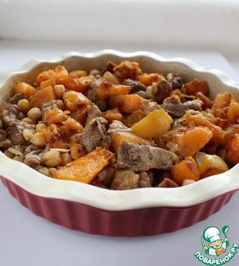 | Домашнее сытное рагу с поджаренными и потушенными в вине кусочками мяса, с сочными ломтиками тыквы, с приятным и нежным на вкус нутом порадует любого гурмана. |