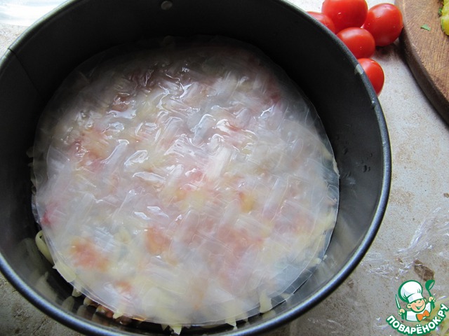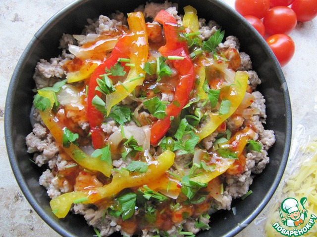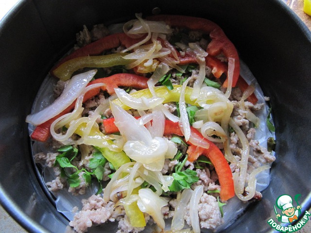 Съемную форму застелить бумагой для выпечки (донышко), бока смазать растительным маслом. Выложить в форму на дно 3-4 листа рисовой бумаги, слой обжаренного фарша, перец болгарский, зелень, обжаренный лук.
