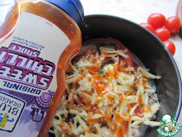 Каждый мясной слой посыпать тертым сыром, полить по-вкусу сладким Соус Чили от Blue Dragon.