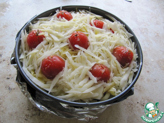 Сверху щедро засыпать все тертым сыром, украсить помидорчиками черри.