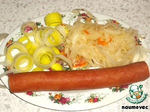 Сосиску режем кружочками и выкладываем на капусту. Сосиска должна быть качественной, с копченым запахом. Я использовала "Венскую".