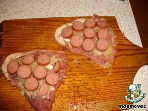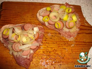 Свинину отбиваем так, чтобы куски были вытянуты в длину. Каждый кусочек разрезаем пополам по толщине, получаем четыре кусочка.