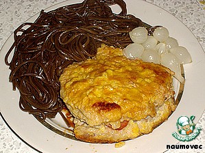 Насыпаем сверху тертый сыр, накрываем оставшимися кусками мяса. Получили своеобразный сэндвич. Каждый сэндвич обмакиваем в яйцо с двух сторон, обваливаем в панировке. На сковороде раскаляем масло, укладываем сэндвичи, накрываем крышкой (это нужно, чтобы сыр расплавился и "схватился") и обжариваем на сильном огне до корочки с двух сторон, следя, чтобы не подгорало. Примерно, по одной минуте с каждой стороны.