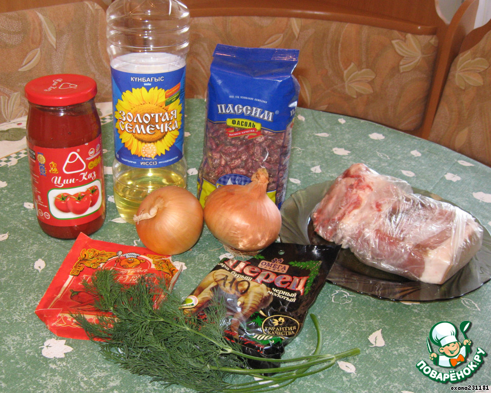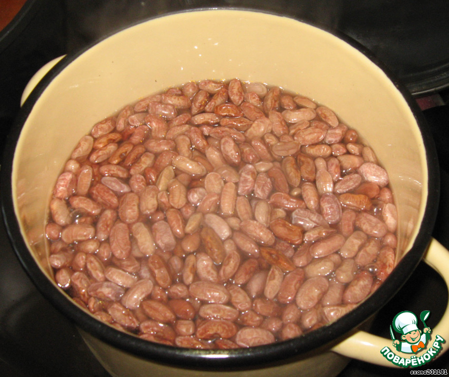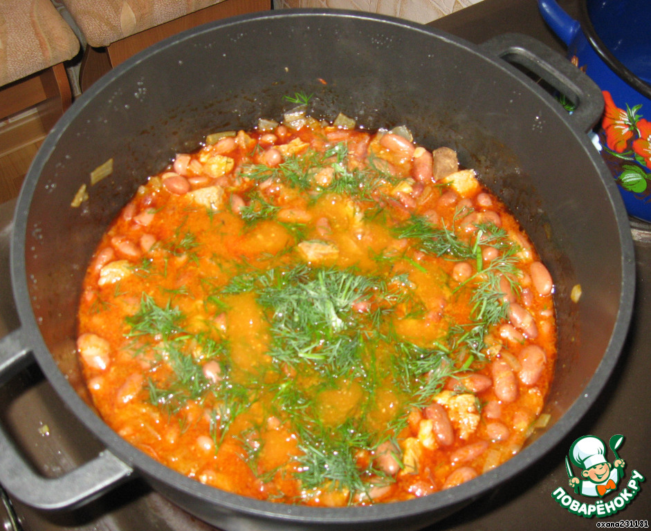фасоль сварить отдельно, когда она станет мягкой, выложить в кастрюлю с мясом.