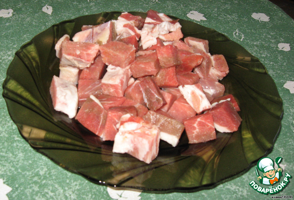 свинину нарезать кусочками и поджарить до мягкости, предварительно посолив.