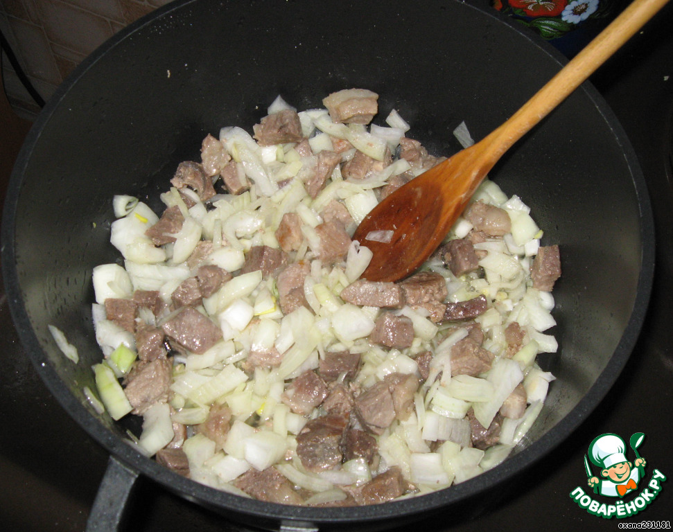 к обжаренному мясу добавить мелконарезанный репчатый лук