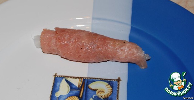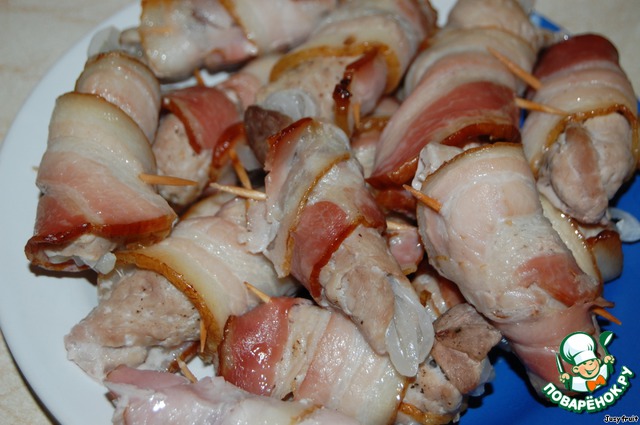 Каждый рулетик обернуть грудинкой и закрепить зубочисткой