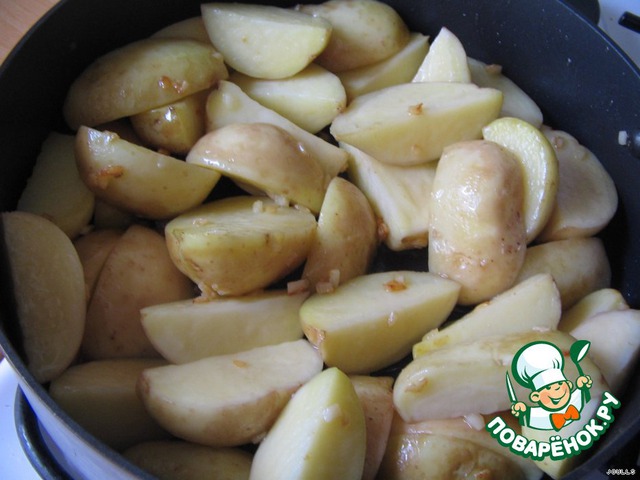 Моем картофель (можно чистить, а можно и время сэкономить).Растапливаем в сковороде сливочное масло, добавляем мелко нарубленный чеснок и тушим 2 минутки. Затем добавляем картофель, порезанный на четвертинки и оставляем в сковороде на 1-2 мин, чтобы он пропитался чесночным ароматом.