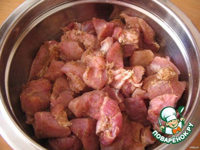 Мясо моем, обсушиваем и нарезаем кусками. Солим, приправляем специями.