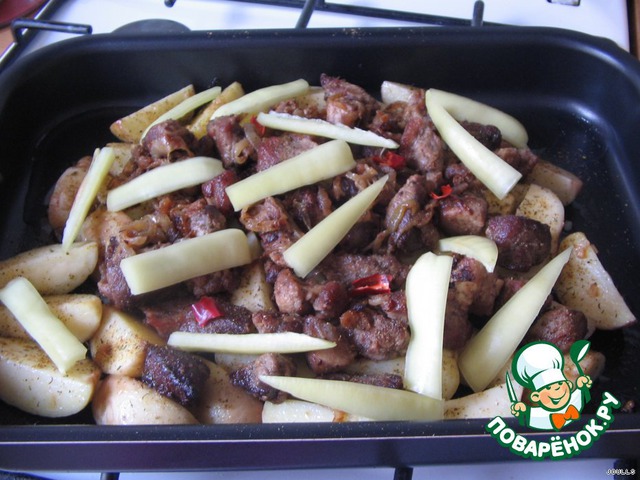 Выкладываем в форму для запекания картофель, мясо с луком, кусочки болгарского перца и перца чили.