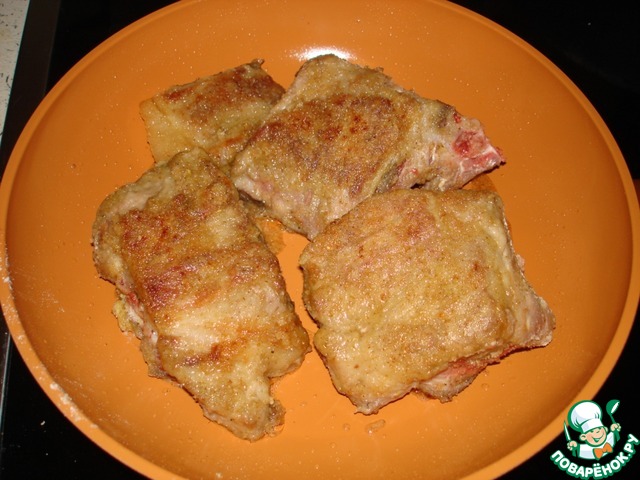 Запанировать рёбрышки и порциями обжарить на масле до румяной корочки.