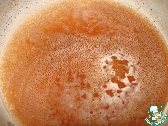 В глубоком сотейнике нагреть немного масла, добавить оставшийся маринад, довести до кипения, добавить вино и снова довести до кипения