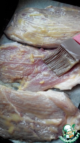 Форму с мясом достаем из духовки, переворачиваем мясо и обмазываем вторую сторону оставшийся масляно-медовой массой. Убираем в духовку еще минут на 5.