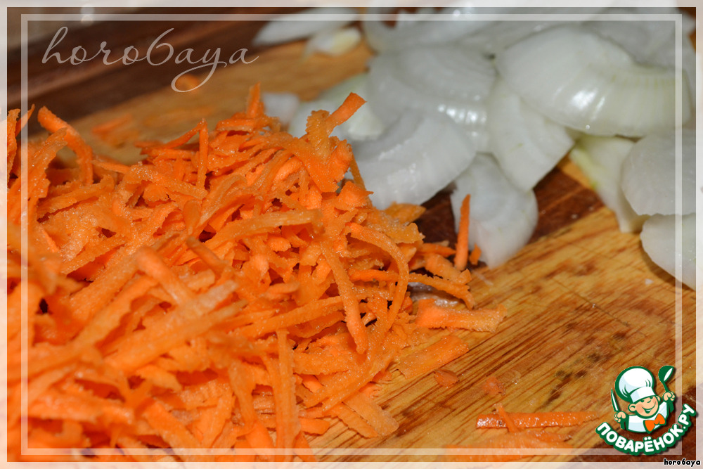 Лук и морковь ополаскиваем водой. Лук очищаем от шелухи и нарезаем полукольцами. Морковь очищаем от кожицы и натираем на крупной терке.