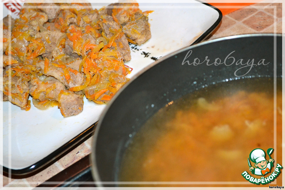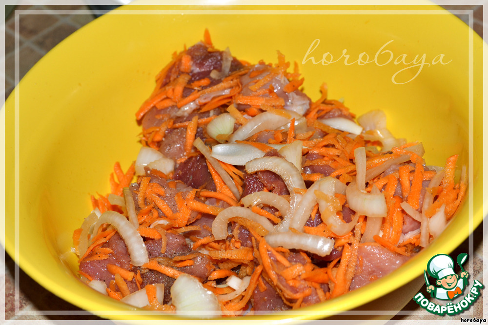 Мясо тщательно промываем под проточной водой и нарезаем на небольшие кусочки. Перемешиваем с луком и морковью.