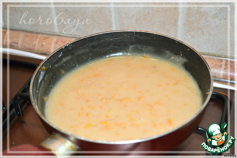 Готовим соус. Сок, который остался в горшочке, выливаем на сковородку, добавляем муку и немного прогреваем до загустения. В полученную смесь добавляем специи по вкусу.
