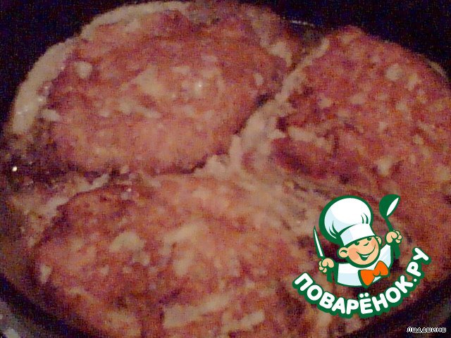 Нагреваем сковороду (лучше использовать с антипригарным покрытием), наливаем немного масла, разогреваем не очень сильно и, положив в руку кусок мяса, выкладываем так называемую панировку и кладем кусок на сковороду «панировкой» вниз.