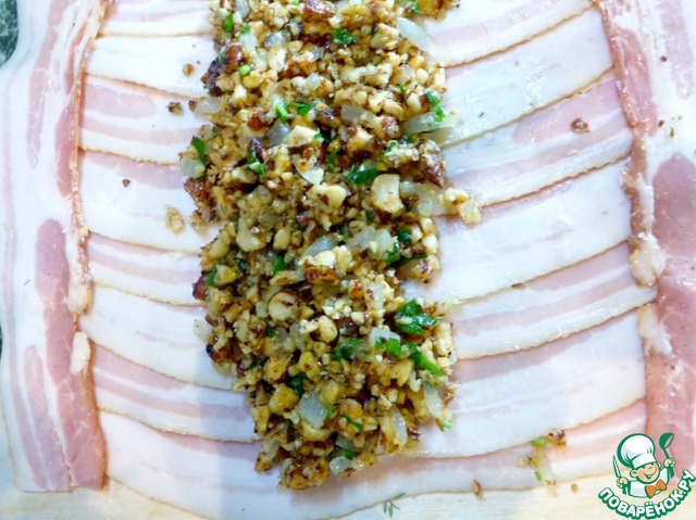 В центр уложить мясо, на него оставшуюся ореховую массу и осторожно обернуть мясо беконом. Можно перевязать кулинарной нитью. Положить мясо в форму.