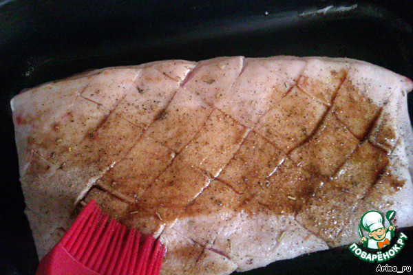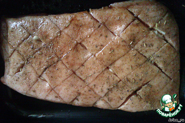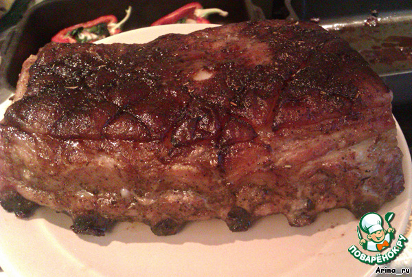 Берём кусок свинины на рёбрышках. Моем, обсушиваем и делаем надрезы на той стороне, где сало. Смешиваем специи, натираем ими мясо со всех сторон. Чуууууть-чуть специй оставляем.