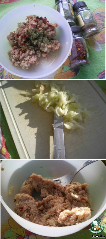 Свинину с луком пропускаем через мясорубку (у меня фарш был сделан предварительно накануне), добавляем в него паприку, петрушку, мускатный орех, солим по вкусу. Примерно треть вырезанной мякоти режем меленько (остальная уже не понадобится, я ее с удовольствием съела), тоже в фарш и все перемешиваем. У меня мясо, хоть и свинина, но постная, такого количества яблока в фарше хватило, чтобы сохранить сочность, но не забить вкус мяса. Если положить больше, свинина «потеряется».