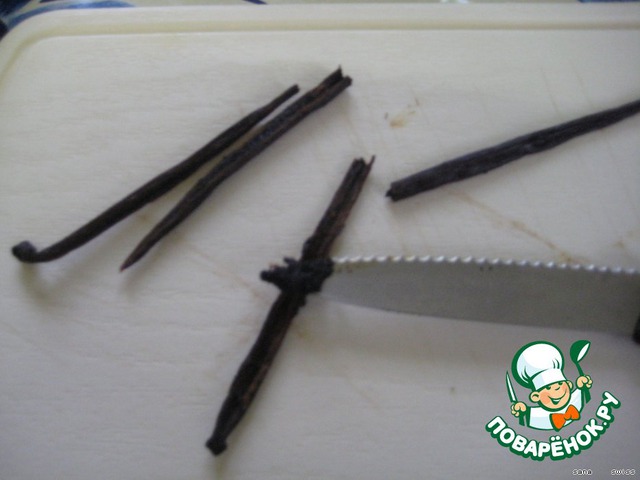 Стручки ванили разрезать пополам и ножом отделить ванильные зернышки.