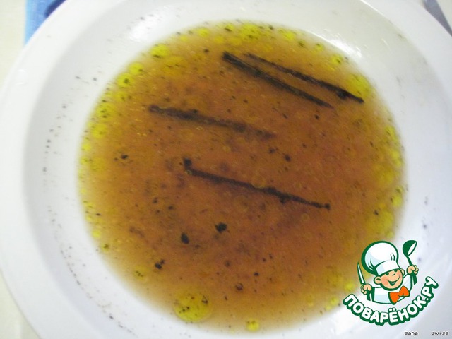 Сделать маринад: лимонный сок, мед, соевый соус, вино белое сухое, оливковое масло, стручки ванили с ванильными зернышками - перемешать,