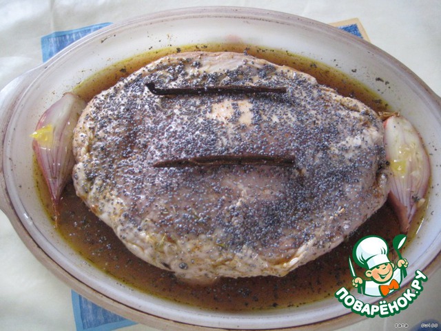 Свинину поперчить, посолить, обсыпать маком и выложить в огнеупорное блюдо, добавить лук (на 2 части), залить маринадом и жарить в разогретой духовке (200°C) 1-1,5 часа, периодически переворачивая и доливая жидкость (если необходимо).