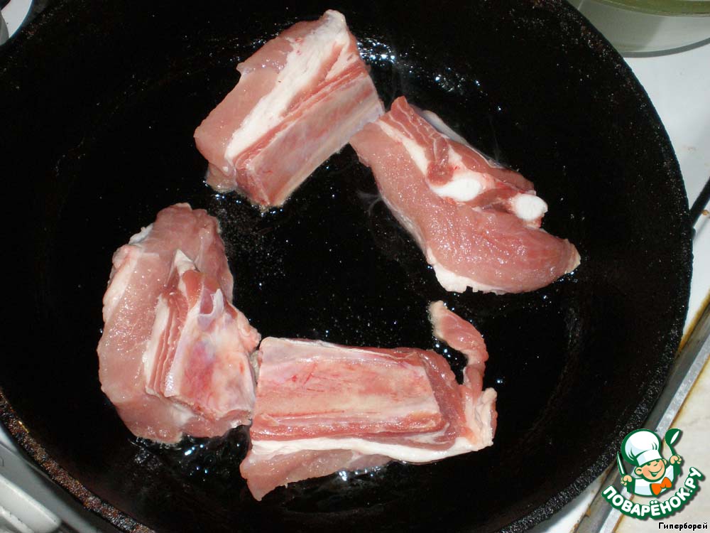 Разделываем грудинку на несколько частей и обжариваем на хорошо разогретой с растительным маслом сковороде.