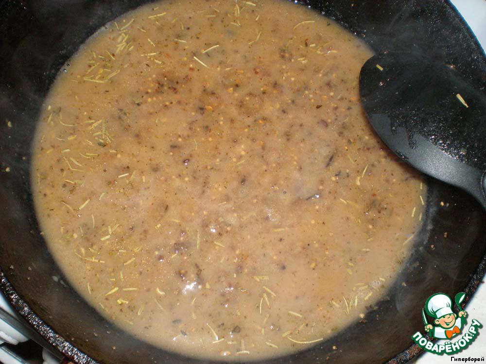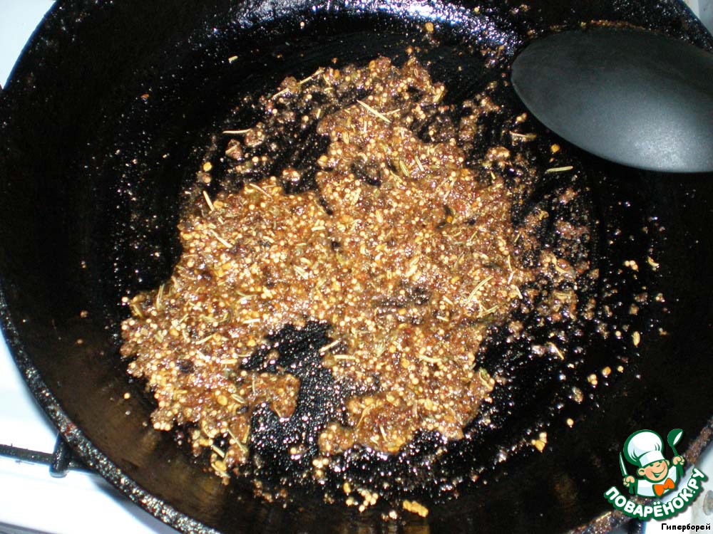 В сковороду, в которой обжаривалась грудинка всыпаем горчицу и шамбалу в зернах (в случае необходимости, добавить масло). Затем добавляем смесь приправ.