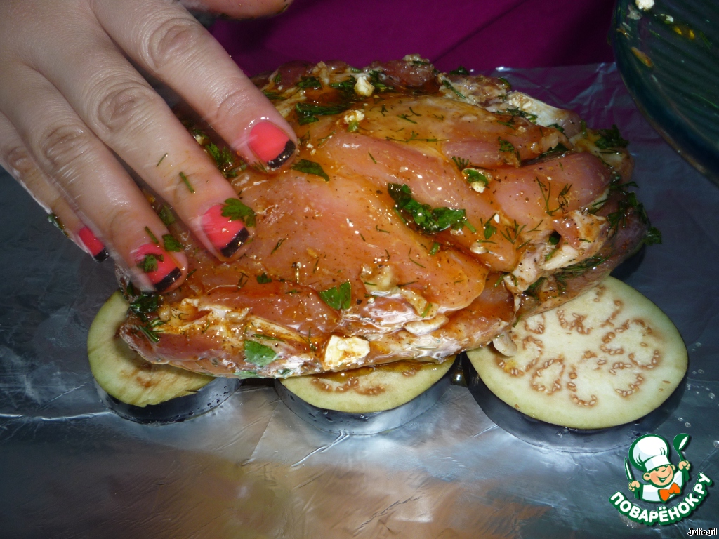 Край фольги складываем вдвое. Теперь делаем подушку для мяса: на фольгу выкладываем кружок баклажанов.