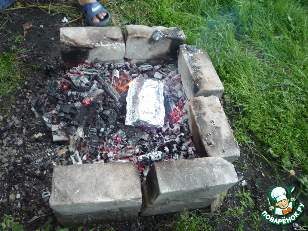 Сверху присыпаем раскалёнными углями и оставляем на 40 минут. Тем временем не забываем поддерживать в костре жар. Я воспользовалась этим временем и сверху на решётке пожарила чесночные булочки.