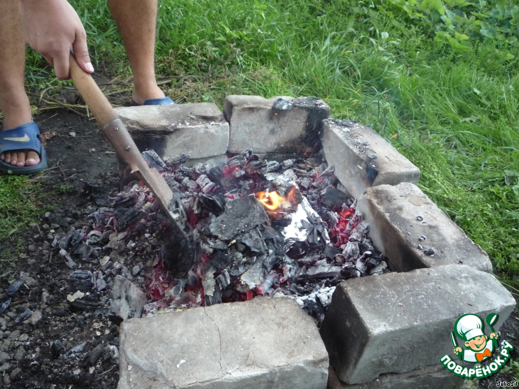 Пришло время отправить мясо в угли. Делаем среди углей ямку и кладём туда мяско.