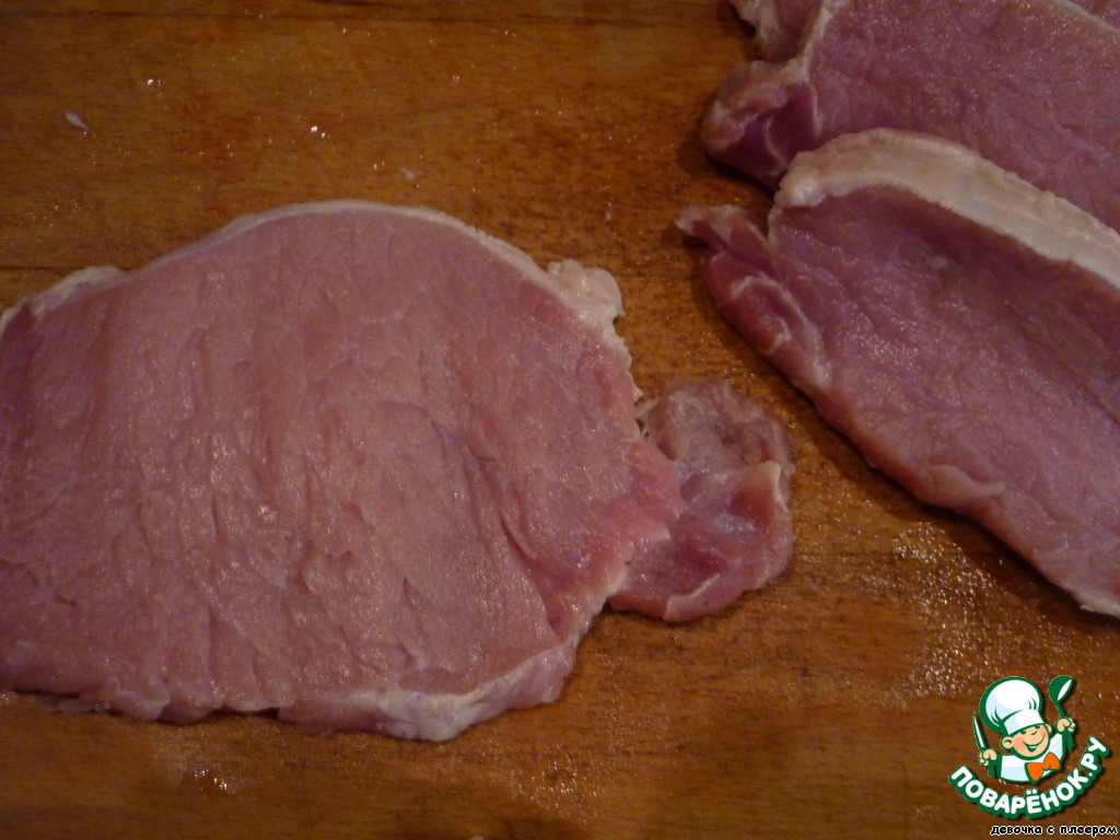 Свинину нарезать порционными кусками, слегка отбить. Посолить, поперчить, приправить мускатным орехом.