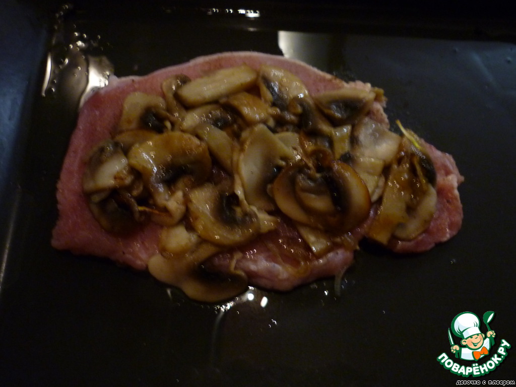 Противень смазать растительным маслом, выложить отбивные. На каждый кусок мяса выложить несколько ложек грибной смеси.