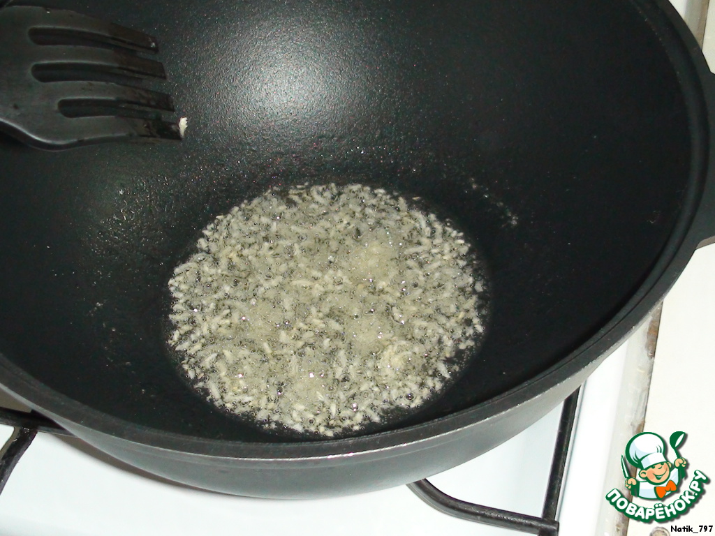 Теперь берем казан или глубокую сковороду с толстым дном, разогреваем ее, добавляем растительное масло. Когда масло хорошо нагреется, кладем в него чеснок и мешаем до того момента как он станет немного румяным. МММММммммм, какой аромат уже пошел!!! Невозможно устоять!!!