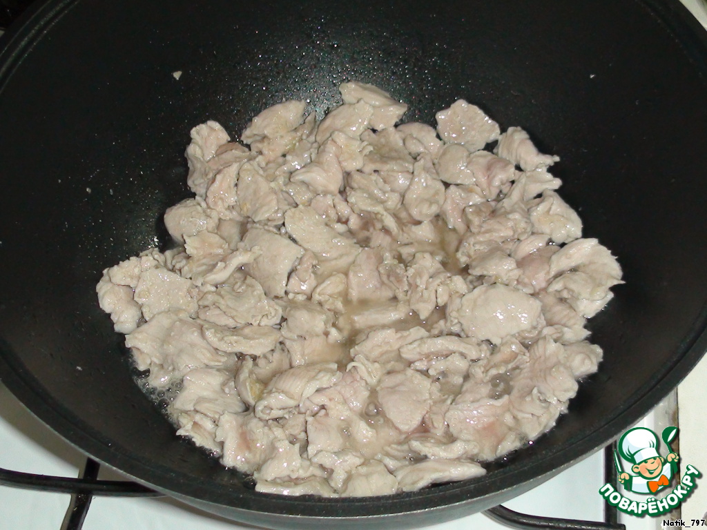 Когда мяско пустит сок, убавляем огонь, накрываем крышкой и тушим минут 10 (не забываем помешивать по необходимости).