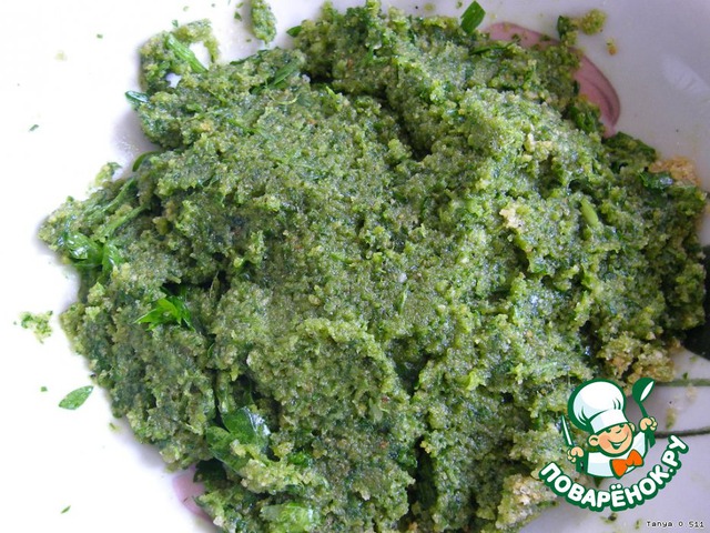 Из панировочных сухарей, чеснока, петрушки, перца, соли и растительного масла сделать пасту (блендером)