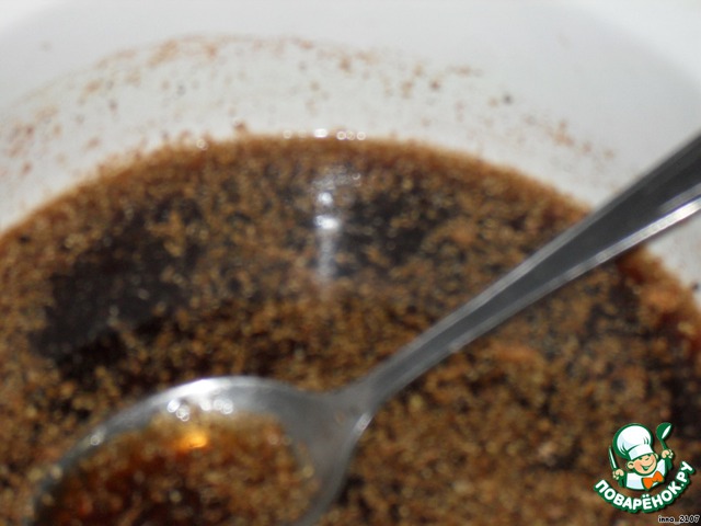 В белое сухое вино добавить гранатовый соус, мускатный орех, молотый кориандр, измельченный чеснок, соль и перец.