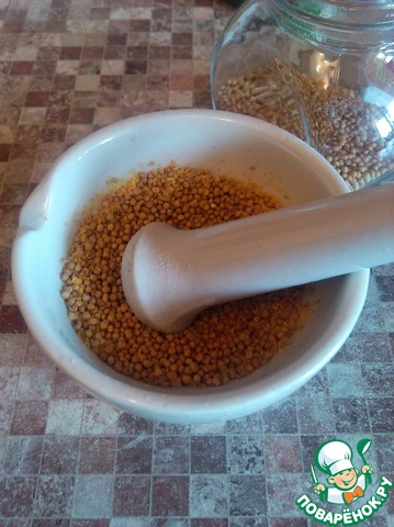 Для маринада растираем в ступке семена горчицы (но не до конца, часть растираем, часть оставляем целыми)