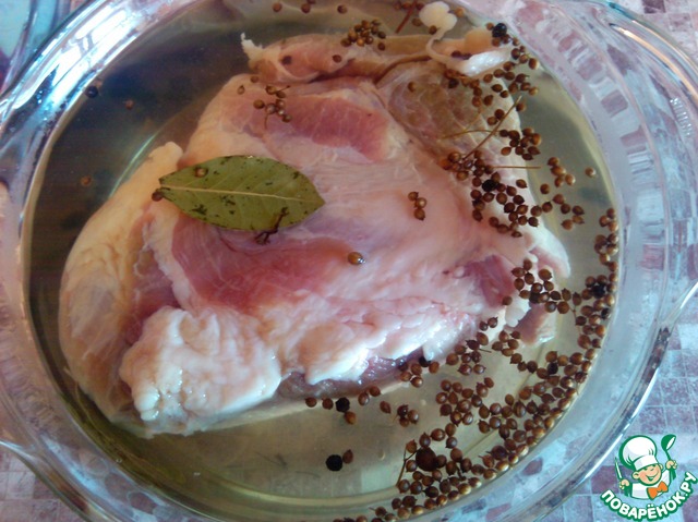В рассол погружаем мясо, накрываем крышкой и убираем засаливаться в холодильник на 1 сутки