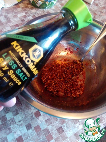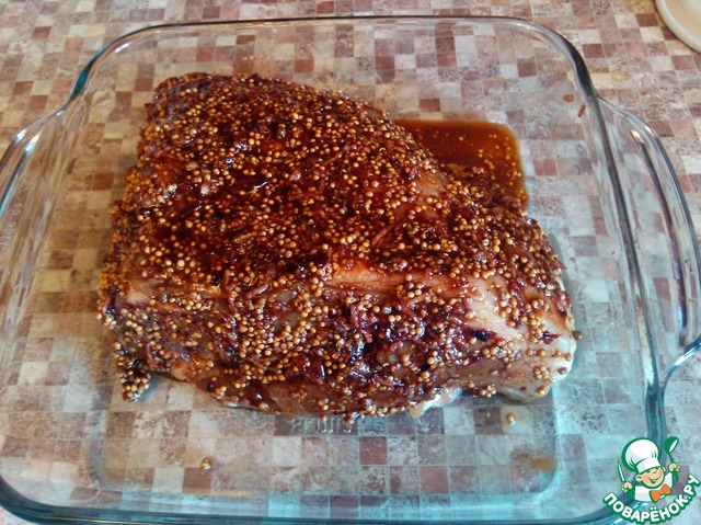Мясо кладем в форму для запекания, обмазываем со всех сторон маринадом