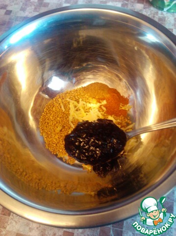 Добавляем к растертой горчице сухие специи для маринада, измельченный чеснок и черносмородиновый джем, перемешиваем