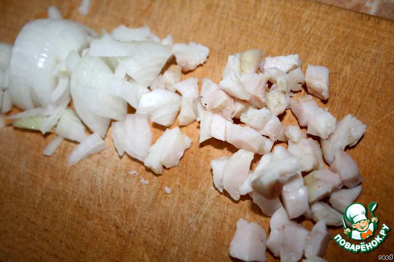 Затем мясо вынимаем и тщательно обтираем. Лук и сало режем мелкими кубиками. Растапливаем сало в кастрюле, добавляем к нему подсолнечное масло, мясо и лук. Все хорошо перемешиваем
