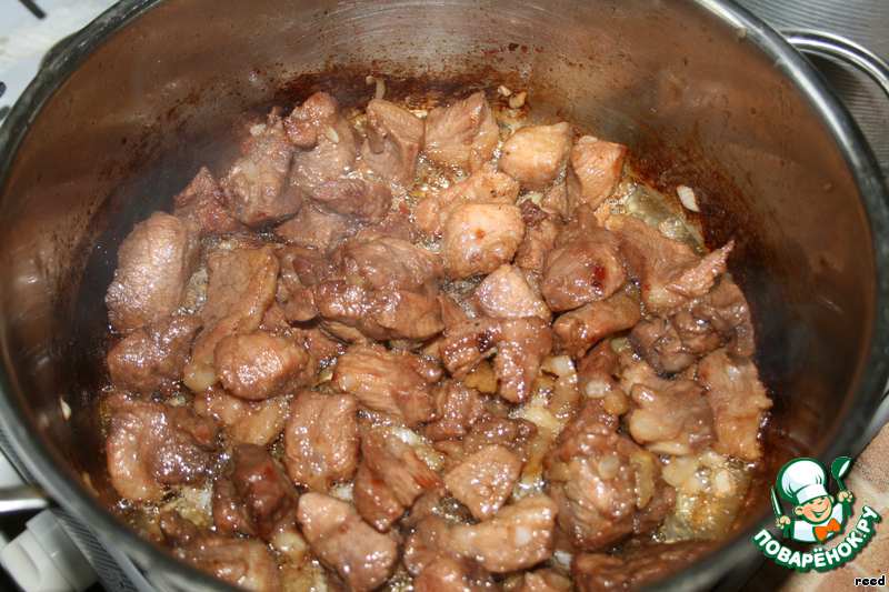 и обжариваем мясо до румяной корочки. Вливаем процеженный маринад, накрываем крышкой и тушим до готовности.