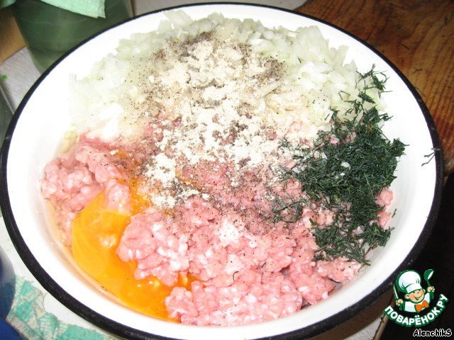 Мясо пропускаем через мясорубку, лук и укроп мелко режем. Добавляем яйцо, соль, перец, хмели-сунели (у меня натуральные, я кладу 1-1,5 чайной ложки, магазинных может потребоваться немного больше, нужно смотреть по вкусу). Хорошенько перемешиваем.