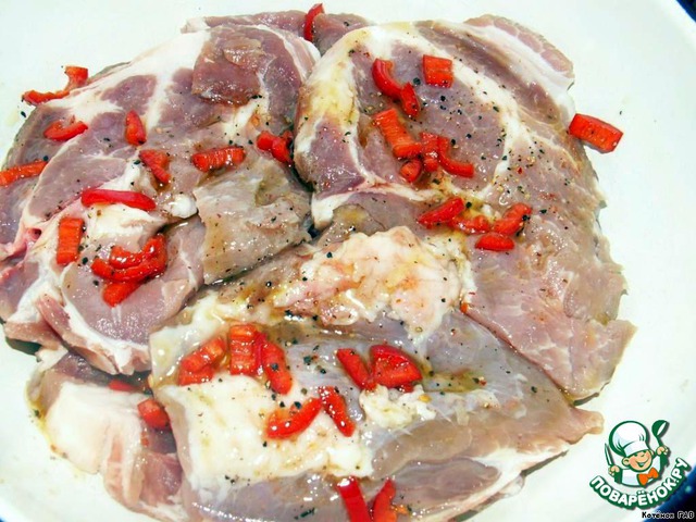 Маринуем мясо в специях, уксусе, половине оливкового масла + резаный чеснок, чили перец, соус чили.