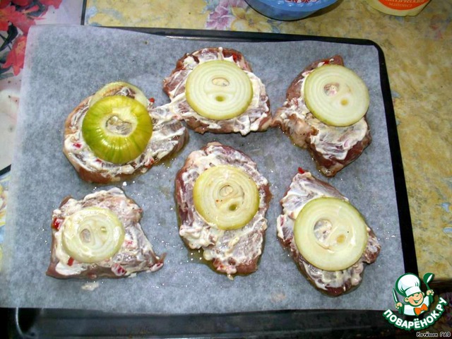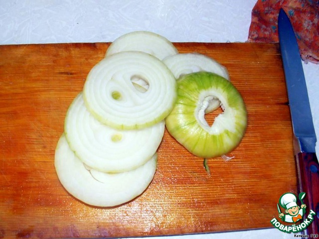 Режем лук кольцами. Сюда можно и помидор кольцами, можно и баклажан кольцом, предварительно немного обжаренный. Кто как любит. У меня был только лук. =)
