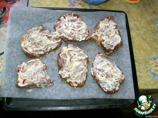 Выкладываем мясо на противень, можно и на решeтку мангала и просто жарить на огне.